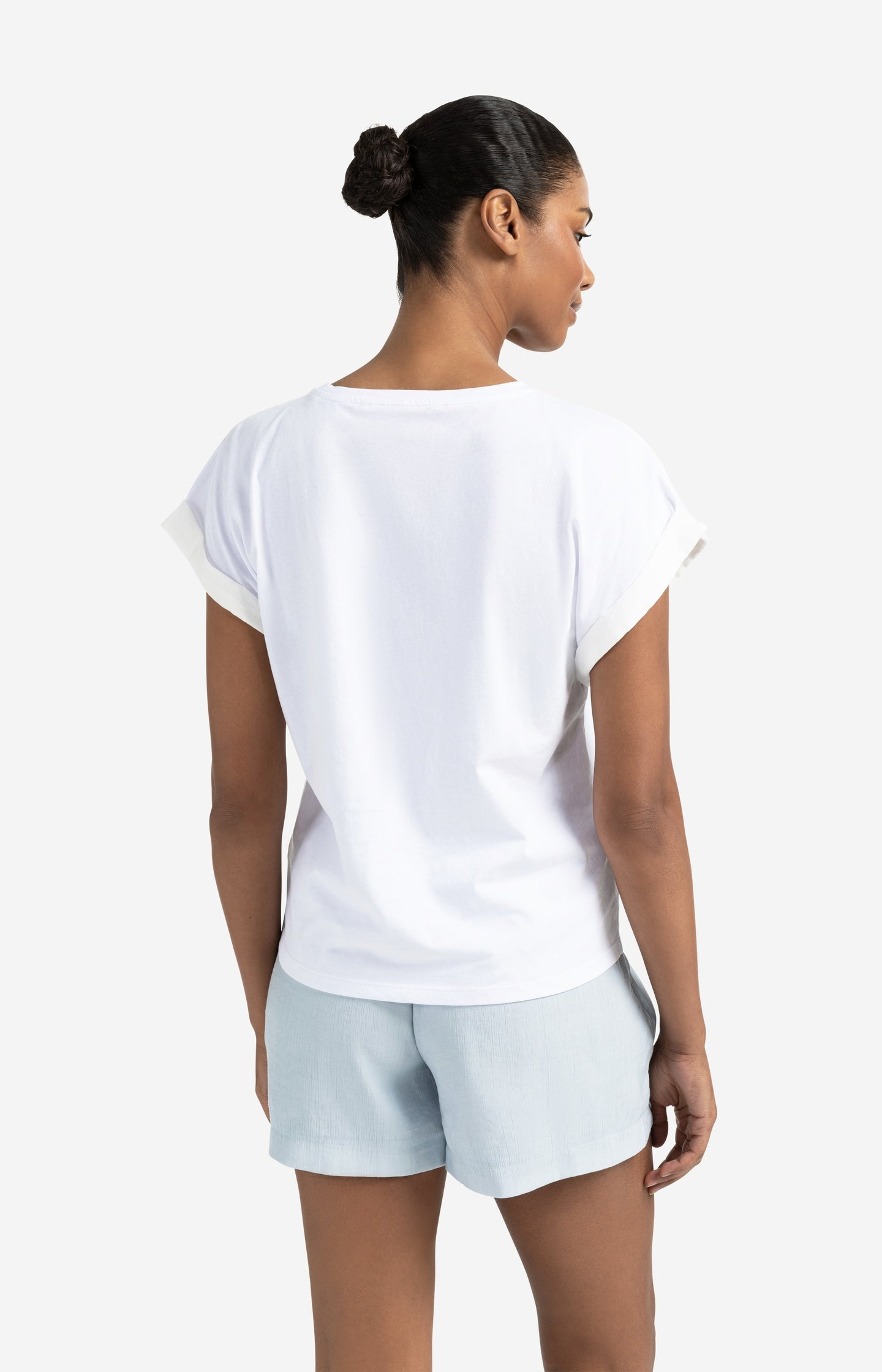 Dieses entspannte Oberteil aus weicher Baumwolle besticht durch kurze Ärmel mit weiten gewebten Bündchen. Es hat einen Rundhalsausschnitt und eine normale Passform und bietet einen zeitlosen Look mit einem raffinierten Touch. Das dezente Ärmeldetail verleiht diesem Alltagsbasic eine moderne Note. Das Model ist 176 cm groß und trägt Größe S.
