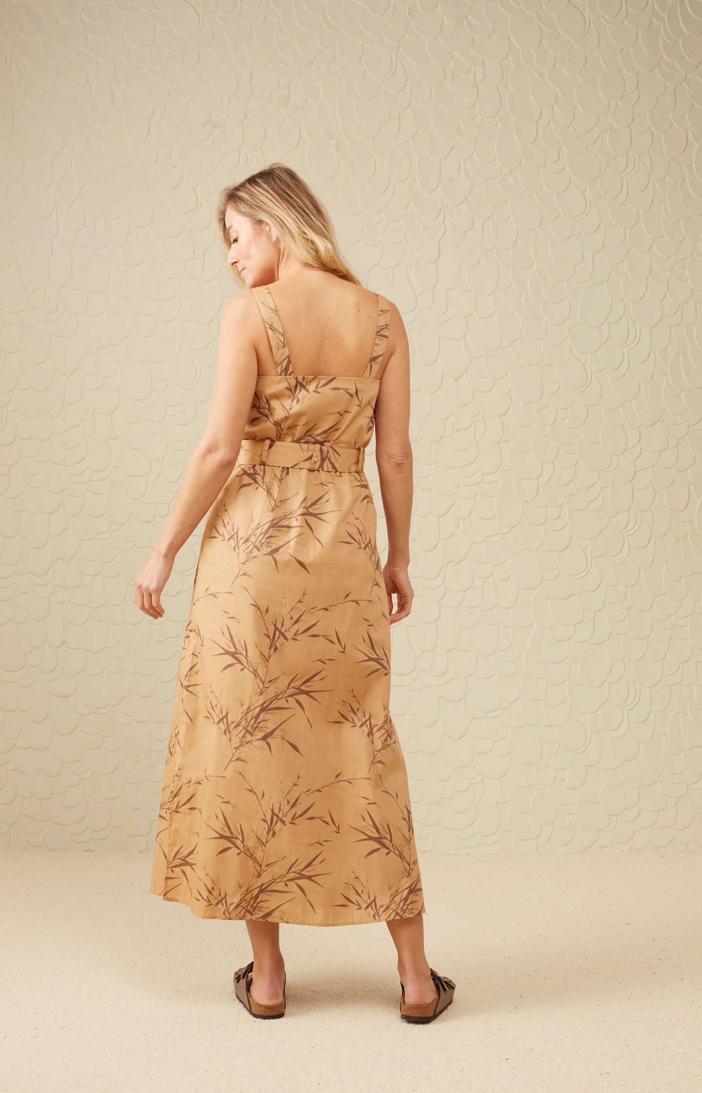 Ein gewebtes Maxikleid in femininer Passform mit eckigem Ausschnitt, Schlitzen an beiden Seiten und einem Taillengürtel zur Anpassung der Passform. Das Kleid ist mit einem dezenten Bambusmuster verziert, das für einen sommerlichen Look sorgt. Unser Model ist 178 cm groß und trägt Größe 36.