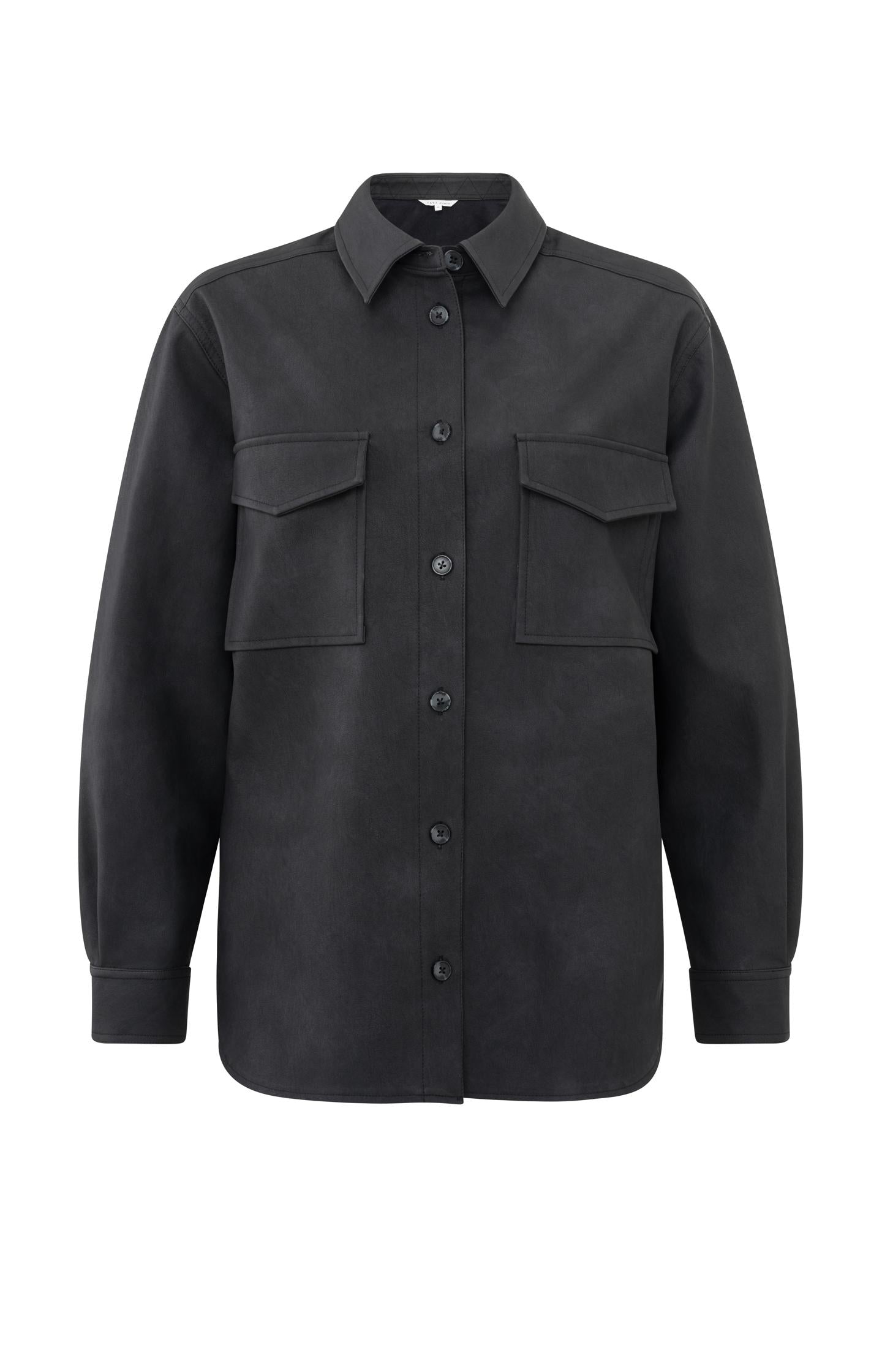 This oversized blouse features a classic collar and long sleeves. The blouse is equipped with two flap chest pockets and closes with buttons. Made from soft faux leather fabric that feels comfortable. Perfect to pair with a casual or formal outfit.