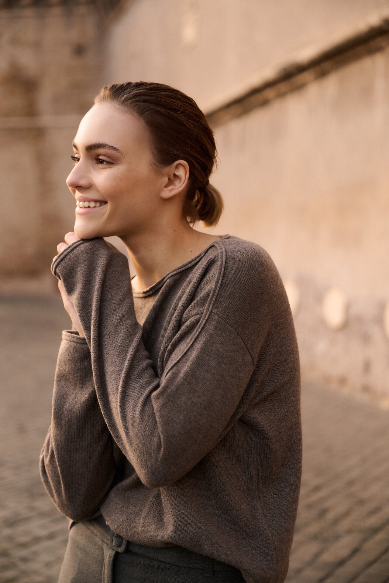 Cool browns, such as taupe, greyish brown and muted brown, are ideal for summer and winter types. If your skin is pale or has a pink undertone, your eyes are blue or grey-green, and your hair is ash blond or dark, these tones enhance your natural features. They soften your look and add a calm, refined elegance. Cool browns pair beautifully with cool colours like navy, lilac and purple.