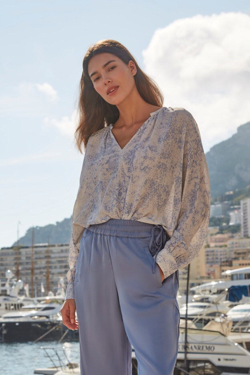 Blouse col V, manches longues ballon et imprimé