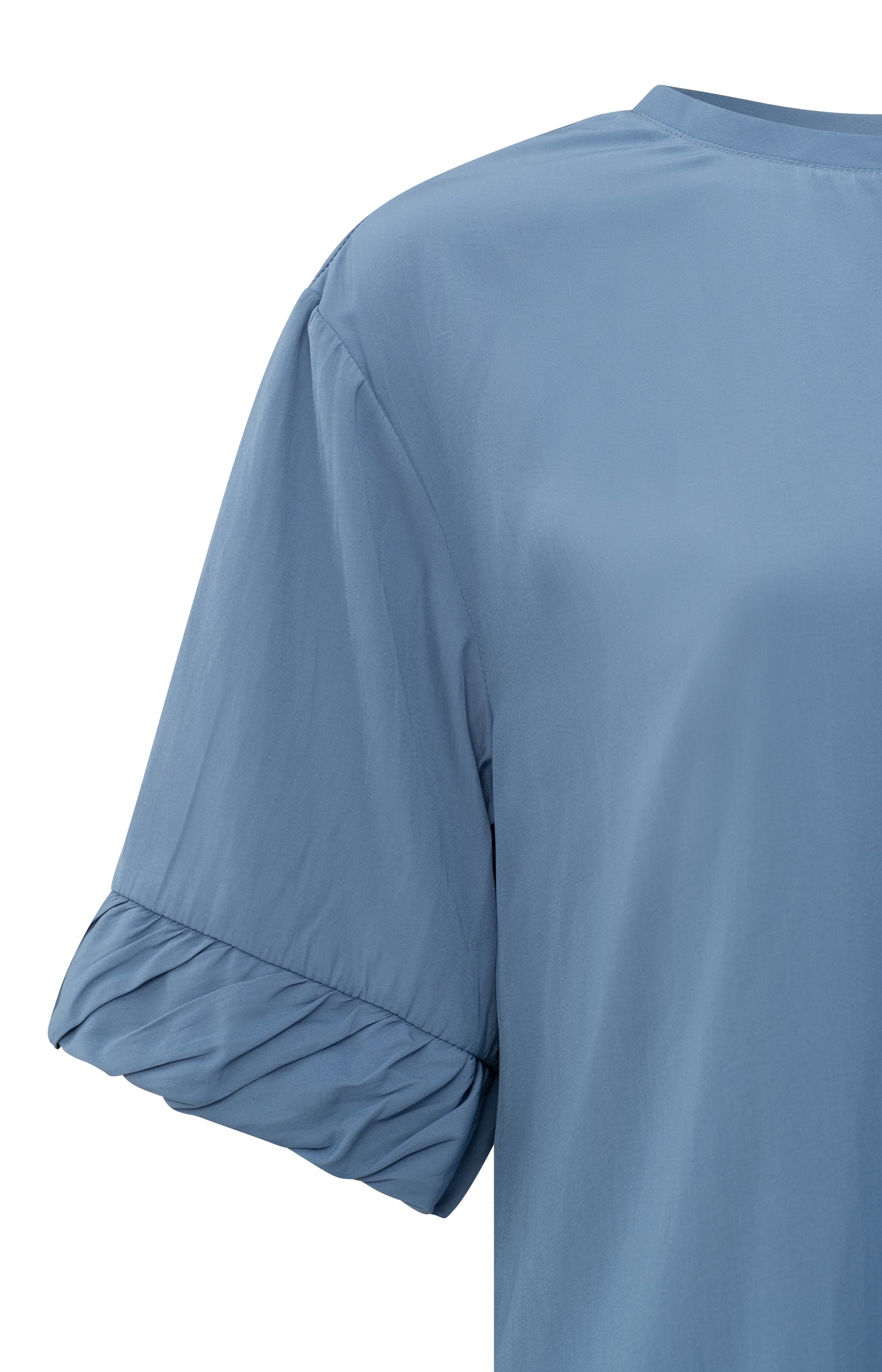 Un haut fluide à la coupe carrée avec un col rond et des demi-manches à volants. L'arrière en coton donne un joli mouvement au tissu. Notre mannequin mesure 1m71 et porte une taille 36.