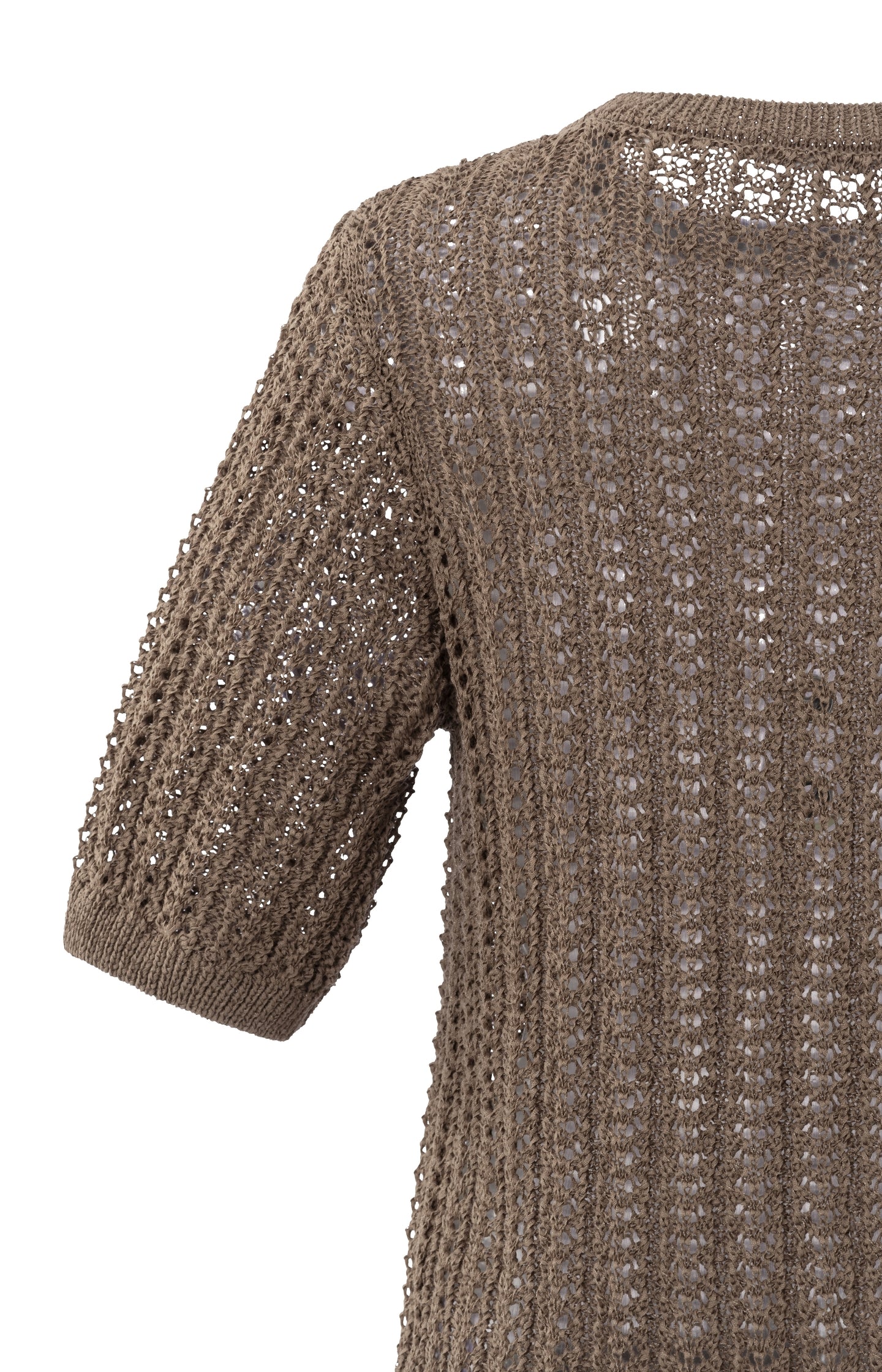 Ce pull élégant est confectionné dans une structure légère en maille ruban et présente une coupe ajustée. L'encolure ronde et les manches mi-longues rehaussées de finitions côtelées ajoutent une touche de fantaisie et de modernité. Il se marie parfaitement avec un pantalon ou une jupe pour un look à la fois décontracté et élégant. Le mannequin mesure 173 cm et porte une taille S.