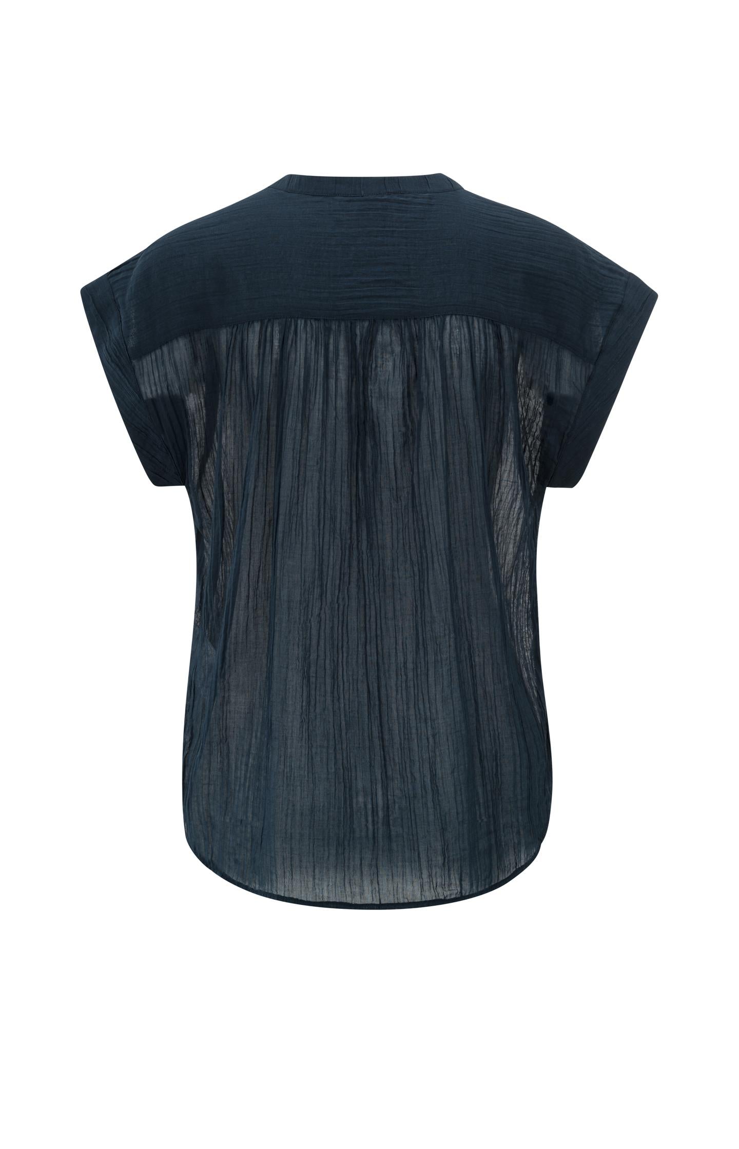 Cette blouse aérée est faite à partir d'une matière légère, semi-transparente et délicatement texturée. Elle a une patte de boutonnage courte, un col polo rond et des manches capes pour créer une coupe décontractée. Le dos est plissé avec légèreté pour apporter une touche féminine. Parfait pour un look féminin et décontracté. Le mannequin mesure 178 cm et porte une taille 36.