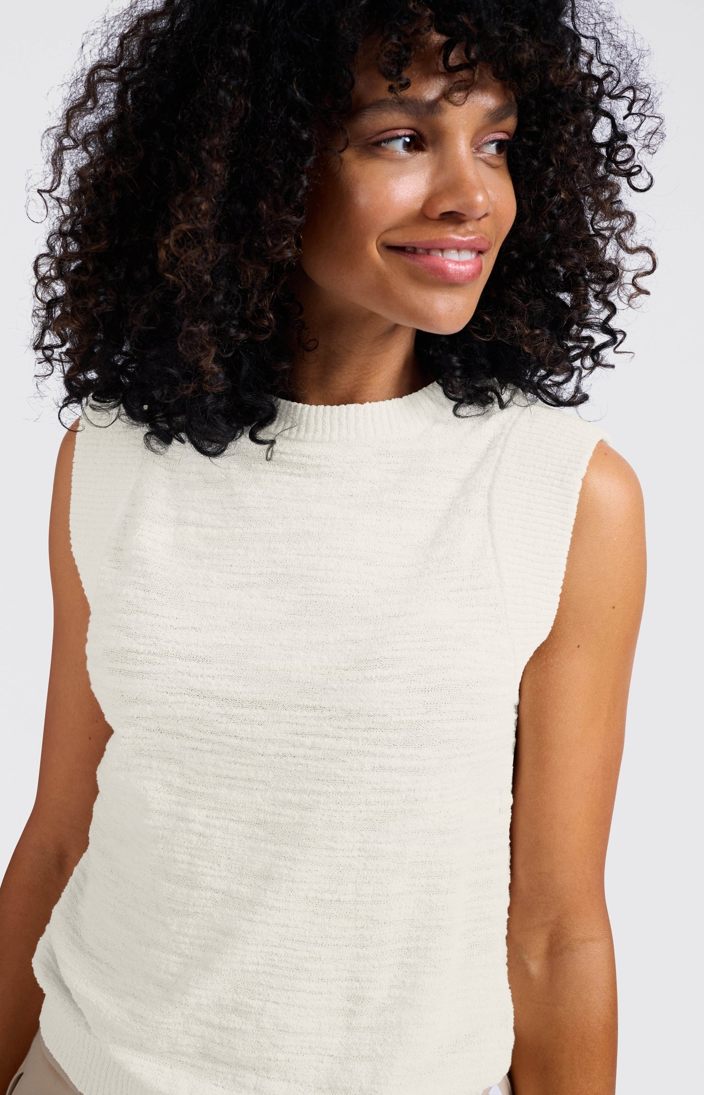 Cet élégant débardeur a u00110e maille subtilement texturée qui ajoute de la profondeur à la pièce. Il a une coupe droite, un col rond et des bords côtés pour un look raffiné. Idéal pour créer une tenue en superposition ou bien à porter seul pour une tenue plus sophistiquée. Une pièce polyvalente à ajouter à sa garde-robe. Le mannequin mesure 173 cm et porte une taille S.