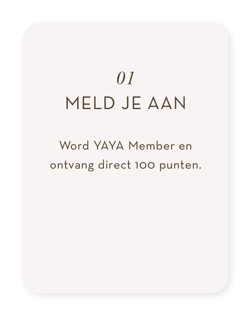 Meld je aan voor ons YAYA Membership vol exclusieve voordelen. Als YAYA Member krijg je als eerste toegang tot onze nieuwe collecties en SALE. Met elke aankoop spaar je automatisch punten voor kortingen op je favoriete items. Bovendien krijg je bij inschrijving direct 100 punten cadeau.