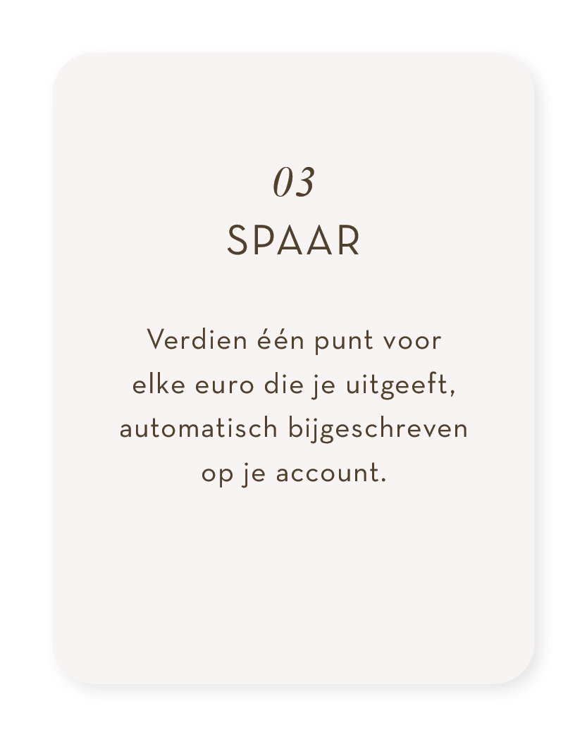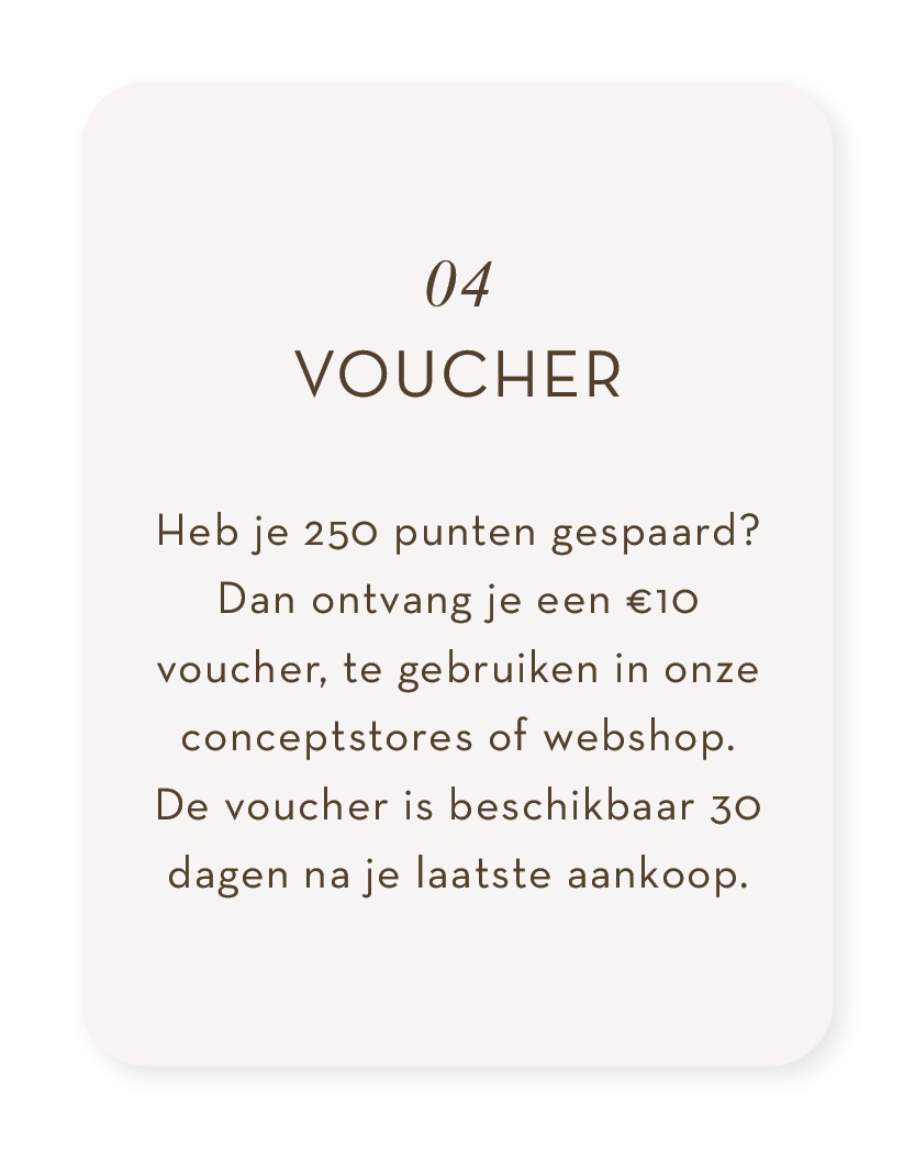 Je spaart automatisch bij elke aankoop die je via onze webshop of in een van onze conceptstores in Nederland, België, Duitsland en Ierland doet. Elke euro die je in een conceptstore of online uitgeeft, is 1 punt waard. In Frankrijk spaar je alleen online. De punten worden 30 dagen na je aankoop op je account bijgeschreven. Bij 250 gespaarde punten ontvang je automatisch een voucher van €10 via de mail.