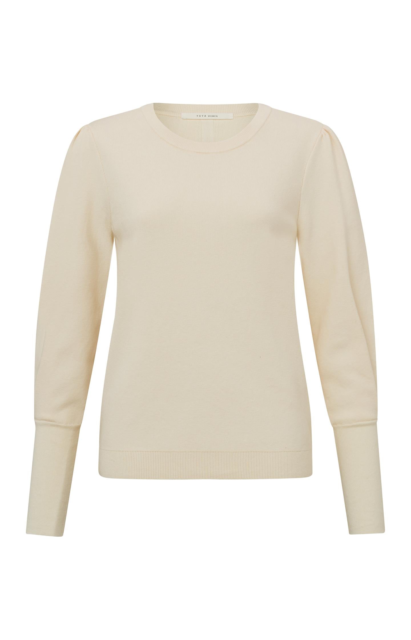 Een trui ontworpen in een normale pasvorm met een ronde hals en lange pofmouwen. De trui is afgewerkt met een naaddetail wat zorgt voor een speelse touch. Het model is 178cm en draagt een maat S.
